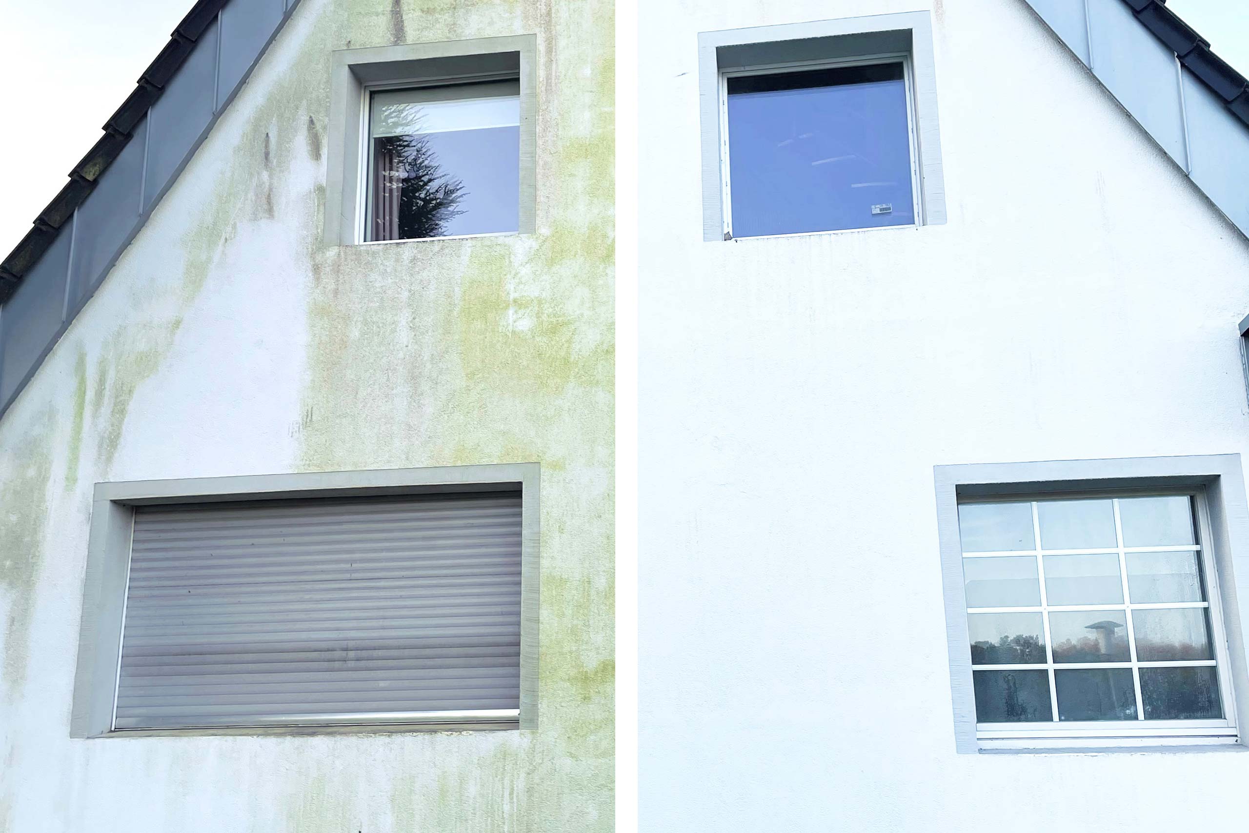 Wir haben Grünbelag, Grauschleier und witterungsbedingte Verschmutzungen materialschonend entfernt. Von der gezielten Behandlung der Problemzonen bis zur großflächigen Reinigung – Ergebnis: eine gleichmäßige, deutlich hellere Fassade mit starkem ersten Eindruck.